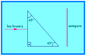 01 - Sofrerão reflexão total e não atingirão o anteparo as radiações para as quais o ângulo de incidência, que vale 45°, superar o ângulo limite do dioptro prisma-ar. As cores que não sofrerão reflexão total são: vermelho, aranjado e amarelo.
