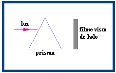 10. (FUVEST) Um feixe de luz é uma mistura de três cores: verde, vermelho e azul. Ele incide, conforme indicado na figura, sobre o prisma material transparente, com índice de refração crescente com a freqüência. Após atravessar o prisma, a luz atinge um filme para fotografia a cores que, ao ser revelado, mostra três manchas coloridas.