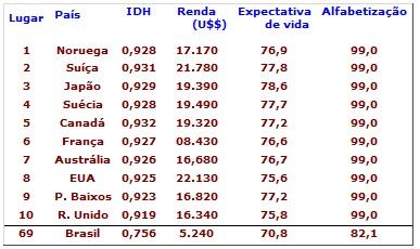 05. Devido aos indicadores sociais apenas razoáveis, o Brasil mantém uma posição modesta, apesar de contar com um dos maiores PIBs do mundo.